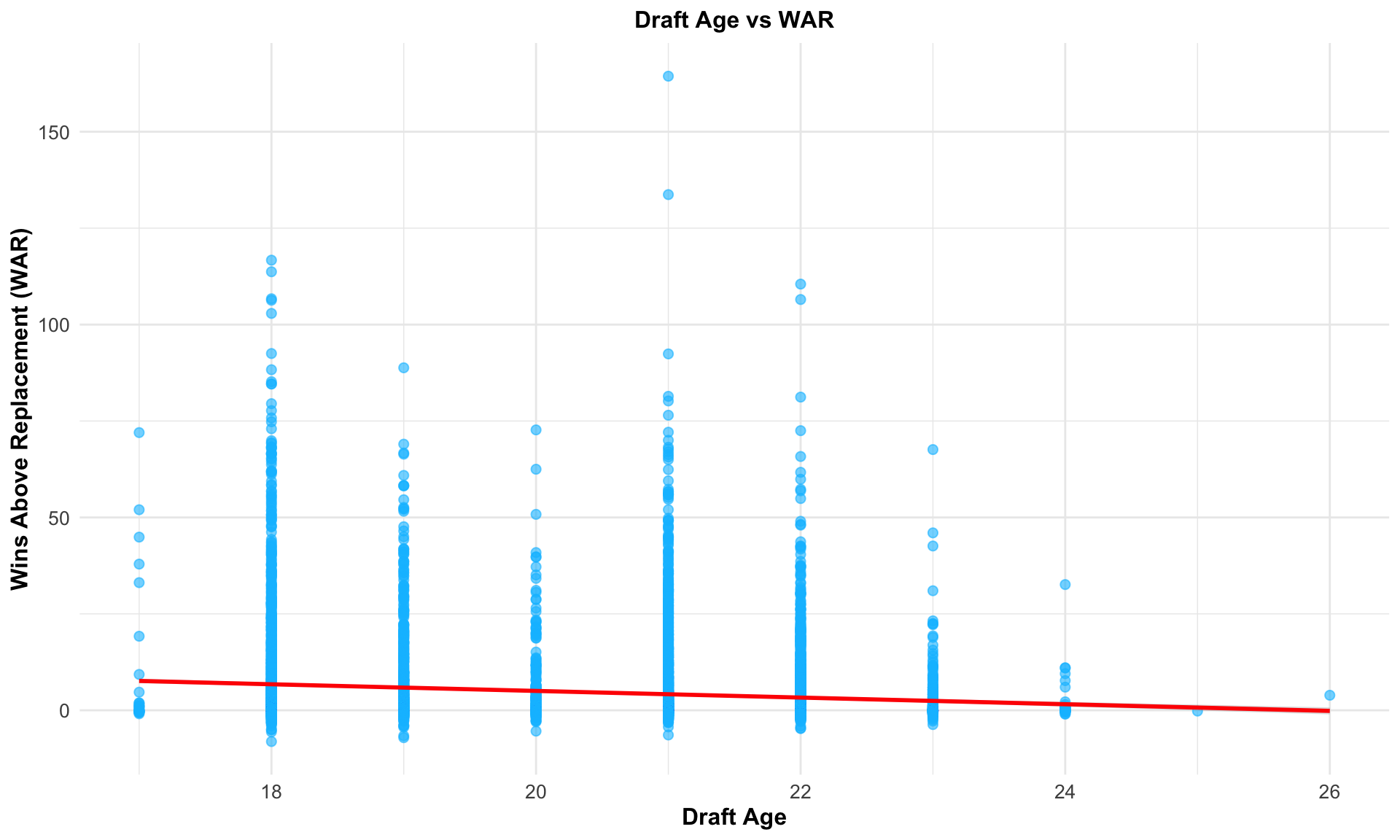 draft_age_war <- players |>filter(!is.na(draft_age)) |>arrange(desc(fWAR))draft_age_plot <-ggplot(draft_age_war, aes(x = draft_age, y = fWAR)) +geom_point(alpha =0.6, size =2, color ="deepskyblue") +geom_smooth(method ="lm", color ="red", se =TRUE, alpha =0.3) +labs(title ="Draft Age vs WAR",x ="Draft Age",y ="Wins Above Replacement (WAR)") +theme_minimal() +theme(plot.title =element_text(size =12, face ="bold", hjust =0.5),axis.title =element_text(size =12, face ="bold"),axis.text =element_text(size =10),legend.title =element_text(size =10, face ="bold"),legend.text =element_text(size =10))draft_age_plot