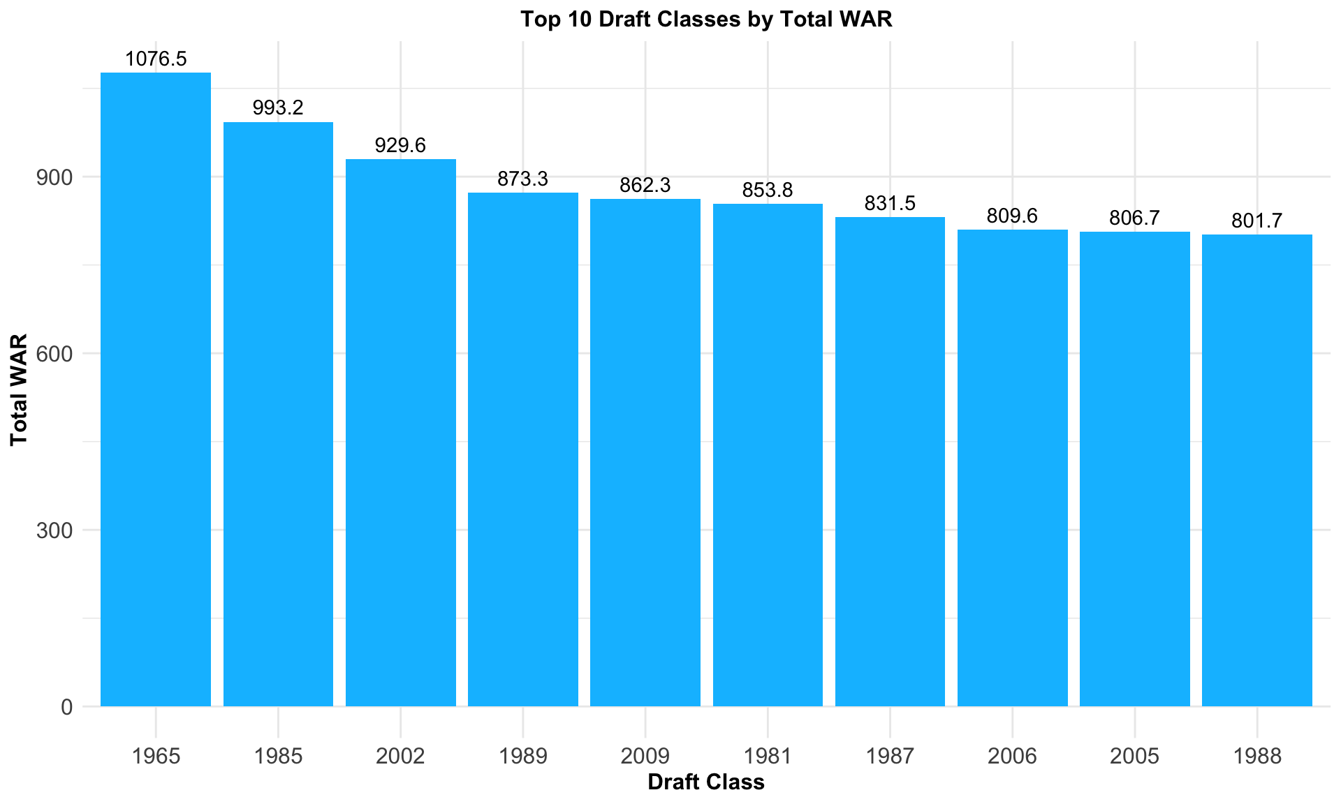 We can see from the barplot that the 1965, 1985, and 2002 draft classes are highly successful with each garnering a WAR value of over 900 across the draft class. 1965 includes the likes of Johnny Bench, Nolan Ryan, and Tom Seaver. Meanwhile, 1985 includes Barry Bonds, John Smoltz, and Randy Johnson while 2002 includes Zack Greinke, Prince Fielder, and Cole Hamels, all whom were incredibly influential baseball legends. The thing these drafts share in common is that they have an abundance of talent, both in terms of Hall of Famers and depth.