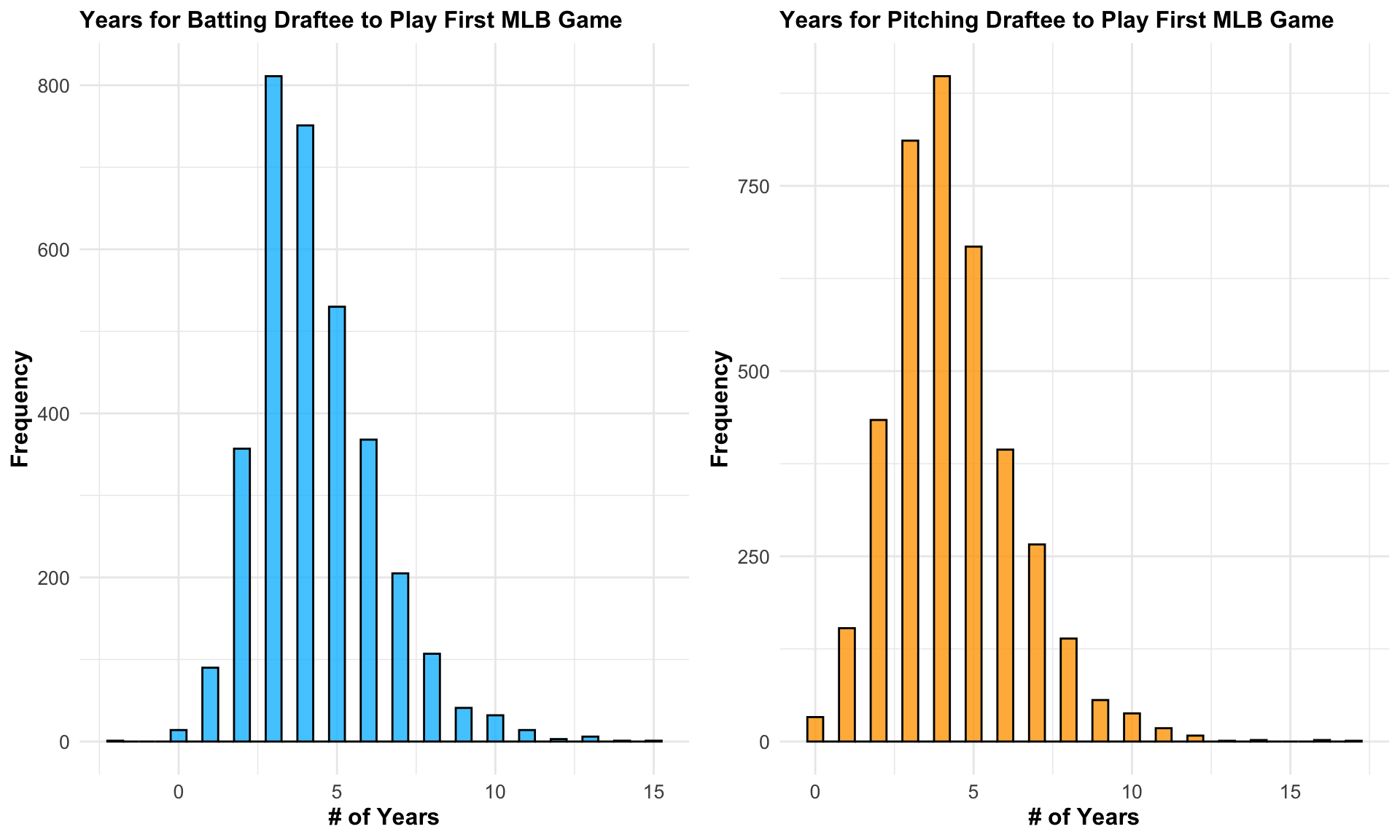 library(gridExtra)bat_stats_df <-fread('data/subsets/bat_stats_subset.csv')pitch_stats_df <-fread('data/subsets/pitch_stats_subset.csv')# Created a new variable for each dataset that gives number of years it took # player to play their first MLB gamebat_stats_df$DifferenceYearsDraftFGPlayed <- bat_stats_df$mlb_played_first - bat_stats_df$yearpitch_stats_df$DifferenceYearsDraftFGPlayed <- pitch_stats_df$mlb_played_first - pitch_stats_df$yearplot1 <-ggplot(bat_stats_df, aes(x = DifferenceYearsDraftFGPlayed)) +geom_histogram(binwidth =0.5, fill ="deepskyblue", color ="black", alpha =0.8) +labs(title ="Years for Batting Draftee to Play First MLB Game", x ="# of Years", y ="Frequency") +theme_minimal() +theme(plot.title =element_text(size =12, face ="bold"),axis.title =element_text(size =12, face ="bold"),axis.text =element_text(size =10),legend.title =element_text(size =10, face ="bold"),legend.text =element_text(size =10))plot2 <-ggplot(pitch_stats_df, aes(x = DifferenceYearsDraftFGPlayed)) +geom_histogram(binwidth =0.5, fill ="orange", color ="black", alpha =0.8) +labs(title ="Years for Pitching Draftee to Play First MLB Game", x ="# of Years", y ="Frequency") +theme_minimal() +theme(plot.title =element_text(size =12, face ="bold"),axis.title =element_text(size =12, face ="bold"),axis.text =element_text(size =10),legend.title =element_text(size =10, face ="bold"),legend.text =element_text(size =10))grid.arrange(plot1, plot2, nrow =1)