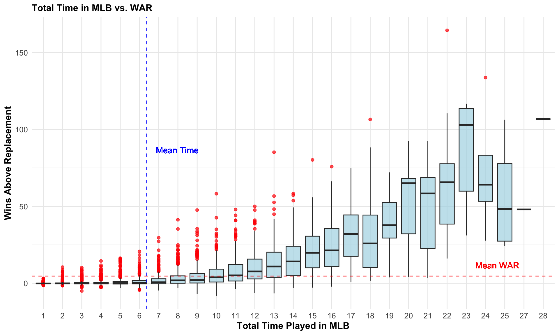 players <-bind_rows(bat_stats_df, pitch_stats_df) |>arrange(desc(fWAR)) |>distinct(person_id, .keep_all = T)players$time_played <- (players$mlb_played_last - players$mlb_played_first) +1ggplot(players, aes(x =factor(time_played), y = fWAR)) +geom_boxplot(fill ="lightblue", alpha =0.7, outlier.color ="red", outlier.size =1.5) +geom_hline(yintercept =mean(players$fWAR, na.rm =TRUE), color ="red", linetype ="dashed", alpha =0.8) +geom_vline(xintercept =mean(players$time_played, na.rm =TRUE), color ="blue", linetype ="dashed", alpha =0.8) +geom_text(aes(x =mean(players$time_played,na.rm=T)+8, y =mean(players$fWAR,na.rm=T)+5, label =paste("Mean WAR")), color ="red", hjust =-4, vjust =0, alpha =0.8) +geom_text(aes(x =mean(players$time_played,na.rm=T)+0.5, y =mean(players$fWAR,na.rm=T)+40, label =paste("Mean Time")), color ="blue", hjust =0, vjust =-10, alpha =0.8) +labs(title ="Total Time in MLB vs. WAR", x ="Total Time Played in MLB", y ="Wins Above Replacement") +theme_minimal() +theme(plot.title =element_text(size =12, face ="bold"),axis.title =element_text(size =12, face ="bold"),axis.text =element_text(size =10),legend.title =element_text(size =10, face ="bold"),legend.text =element_text(size =10))