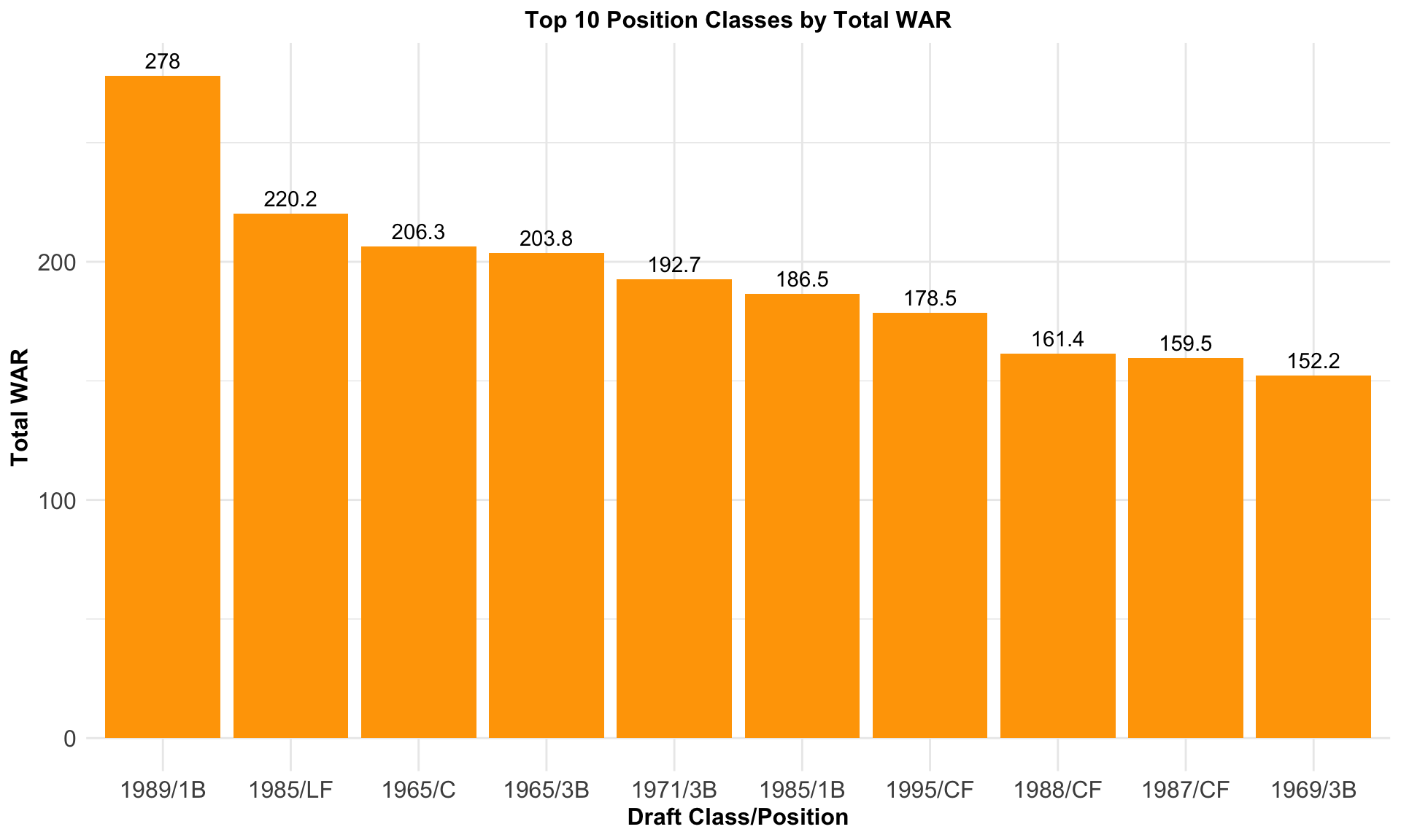total_war_by_pos_and_year <- players |>filter(person_primary_position_abbreviation !="P") |>group_by(year, person_primary_position_abbreviation) |>summarise(total_WAR =sum(fWAR)) |>arrange(desc(total_WAR)) |>ungroup() |>mutate(label =paste(year, person_primary_position_abbreviation, sep ="/"),rank =seq_len(n()))pos_class_labels <- total_war_by_pos_and_year|>slice_head(n =10) |>select(label) |>unlist() |>as.character()# Barplot of total top 10 total WAR Draft Class/Position Combinationpos_class_war <-ggplot(total_war_by_pos_and_year |>slice_head(n =10), aes(x =factor(rank, levels =c(1:10), labels = pos_class_labels), y = total_WAR ) ) +geom_bar(stat ="identity", fill ="orange") +labs(x ="Draft Class/Position", y ="Total WAR", title ="Top 10 Position Classes by Total WAR") +theme_minimal() +theme(plot.title =element_text(hjust =0.5, size =12, face ="bold"),axis.title =element_text(size =12, face ="bold"),axis.text =element_text(size =12),legend.title =element_text(size =10, face ="bold"),legend.text =element_text(size =10)) +geom_text(aes(label = total_WAR, vjust =-0.5))pos_class_war