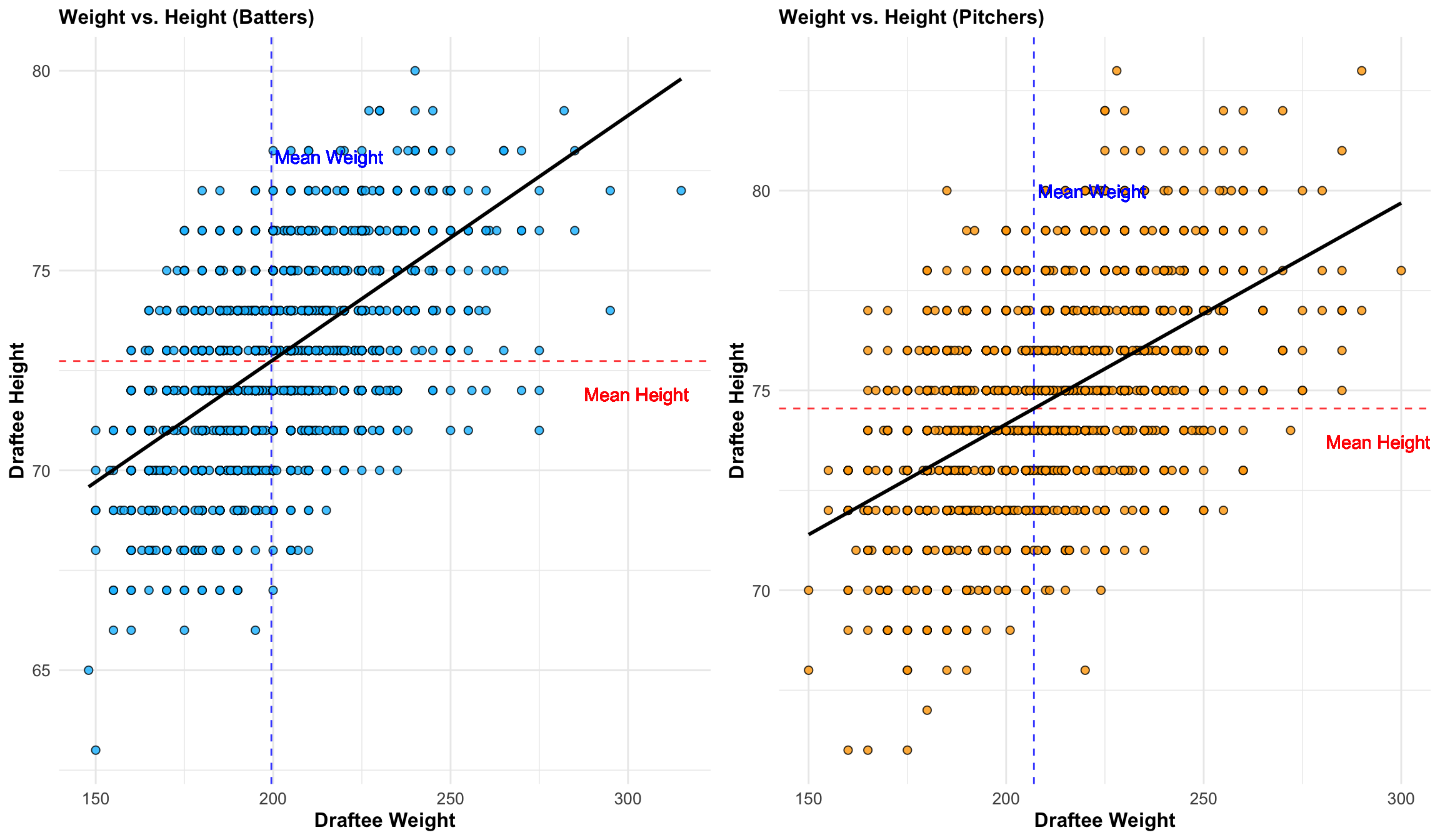 plot1 <-ggplot(bat_stats_df, aes(x = person_weight, y=person_height)) +geom_point(fill="deepskyblue", shape=21, size=2, alpha =0.8) +geom_hline(yintercept =mean(bat_stats_df$person_height,na.rm=T), color ="red", linetype ="dashed", alpha =0.8) +geom_vline(xintercept =mean(bat_stats_df$person_weight,na.rm=T), color ="blue", linetype ="dashed", alpha =0.8) +geom_text(aes(x =mean(bat_stats_df$person_weight,na.rm=T), y =mean(bat_stats_df$person_height,na.rm=T) -1, label =paste("Mean Height")), color ="red", hjust =-3, vjust =0, alpha =0.8) +geom_text(aes(x =mean(bat_stats_df$person_weight,na.rm=T) +1, y =mean(bat_stats_df$person_height,na.rm=T), label =paste("Mean Weight")), color ="blue", hjust =0, vjust =-15, alpha =0.8) +geom_smooth(method ="lm", se =FALSE, color ="black", alpha =0.8) +labs(title ="Weight vs. Height (Batters)", x ="Draftee Weight", y ="Draftee Height") +theme_minimal() +theme(plot.title =element_text(size =12, face ="bold"),axis.title =element_text(size =12, face ="bold"),axis.text =element_text(size =10),legend.title =element_text(size =10, face ="bold"),legend.text =element_text(size =10))plot2 <-ggplot(pitch_stats_df, aes(x = person_weight, y=person_height)) +geom_point(fill="orange", shape=21, size=2, alpha =0.8) +geom_hline(yintercept =mean(pitch_stats_df$person_height,na.rm=T), color ="red", linetype ="dashed", alpha =0.8) +geom_vline(xintercept =mean(pitch_stats_df$person_weight,na.rm=T), color ="blue", linetype ="dashed", alpha =0.8) +geom_text(aes(x =mean(pitch_stats_df$person_weight,na.rm=T), y =mean(pitch_stats_df$person_height,na.rm=T) -1, label =paste("Mean Height")), color ="red", hjust =-2.8, vjust =0, alpha =0.8) +geom_text(aes(x =mean(pitch_stats_df$person_weight,na.rm=T) +1, y =mean(pitch_stats_df$person_height,na.rm=T), label =paste("Mean Weight")), color ="blue", hjust =0, vjust =-16, alpha =0.8) +geom_smooth(method ="lm", se =FALSE, color ="black", alpha =0.8) +labs(title ="Weight vs. Height (Pitchers)", x ="Draftee Weight", y ="Draftee Height") +theme_minimal() +theme(plot.title =element_text(size =12, face ="bold"),axis.title =element_text(size =12, face ="bold"),axis.text =element_text(size =10),legend.title =element_text(size =10, face ="bold"),legend.text =element_text(size =10))grid.arrange(plot1, plot2, nrow =1)