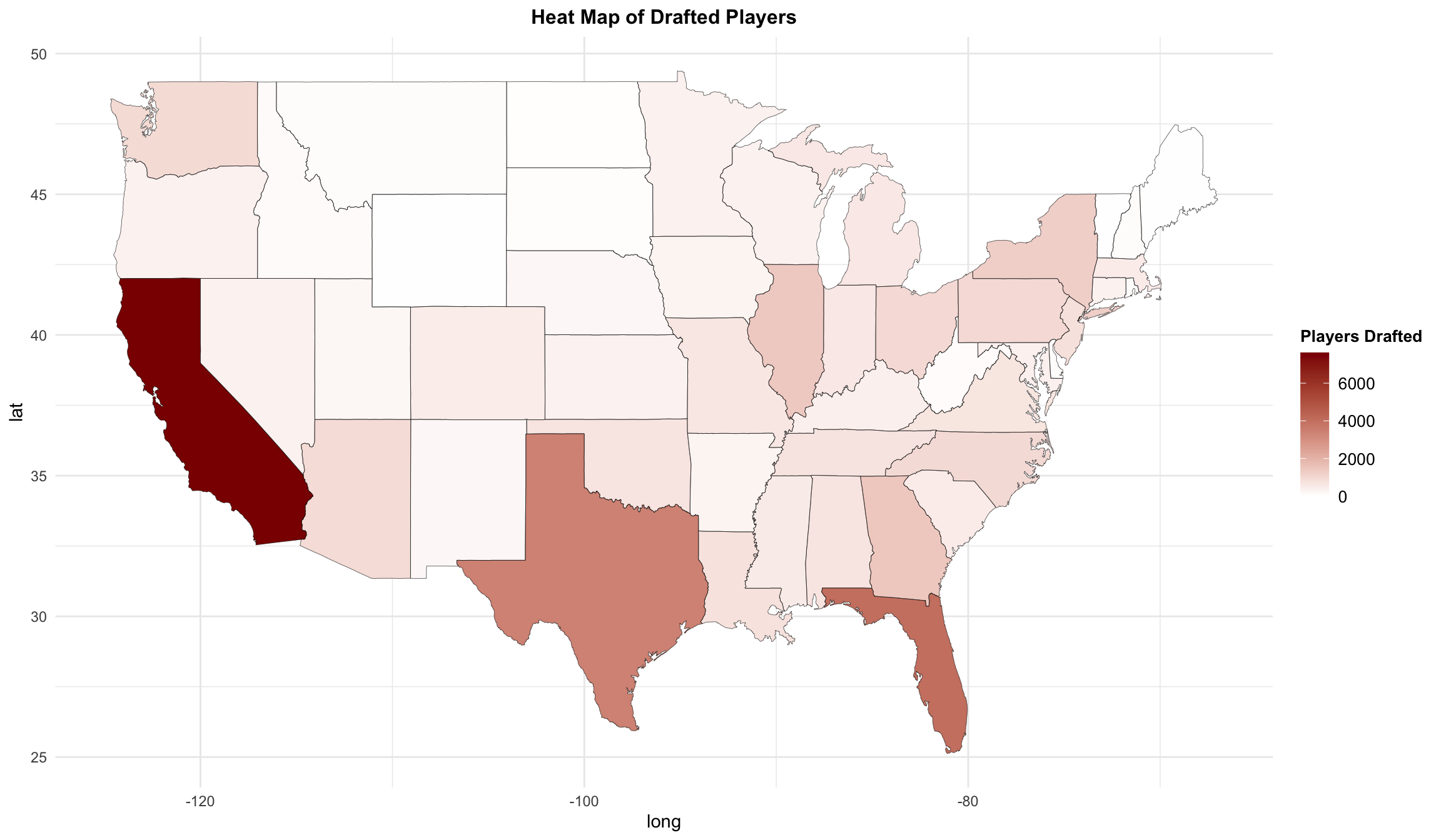 library(ggplot2)library(dplyr)library(maps)# State frequency datastate_freq <-table(draft_info$home_state)# State mapping state_map <-data.frame(abbrev =c("al", "ak", "az", "ar", "ca", "co", "ct", "de", "fl", "ga", "hi", "id", "il", "in", "ia", "ks", "ky", "la", "me", "md", "ma", "mi", "mn", "ms", "mo", "mt", "ne", "nv", "nh", "nj", "nm", "ny", "nc", "nd", "oh", "ok", "or", "pa", "ri", "sc", "sd", "tn", "tx", "ut", "vt", "va", "wa", "wv", "wi", "wy"),full =c("alabama", "alaska", "arizona", "arkansas", "california", "colorado", "connecticut", "delaware", "florida", "georgia", "hawaii", "idaho", "illinois", "indiana", "iowa", "kansas", "kentucky", "louisiana", "maine", "maryland", "massachusetts", "michigan", "minnesota", "mississippi", "missouri", "montana", "nebraska", "nevada", "new hampshire", "new jersey", "new mexico", "new york", "north carolina", "north dakota", "ohio", "oklahoma", "oregon", "pennsylvania", "rhode island", "south carolina", "south dakota", "tennessee", "texas", "utah", "vermont", "virginia", "washington", "west virginia", "wisconsin", "wyoming"))# Convert abbreviations to full state namesstate_freq_df <-data.frame(region =tolower(names(state_freq)),frequency =as.numeric(state_freq)) |>left_join(state_map, by =c("region"="abbrev")) |>mutate(region =ifelse(is.na(full), region, full)) |>filter(!(region %in%c("hawaii", "alaska"))) # U.S. map datastates <-map_data("state")map.df <-merge(states, state_freq_df, by ="region", all.x =TRUE) |>arrange(order)map.df$frequency[is.na(map.df$frequency)] <-0home_heat_map <-ggplot(map.df, aes(x = long, y = lat, group = group)) +geom_polygon(aes(fill = frequency)) +geom_path(color ="black", size =0.1) +scale_fill_gradient(low ="white", high ="darkred", name ="Players Drafted") +labs(title ="Heat Map of Drafted Players") +theme_minimal() +theme(plot.title =element_text(hjust =0.5, size =12, face ="bold"),legend.title =element_text(size =10, face ="bold"),legend.text =element_text(size =10))home_heat_map